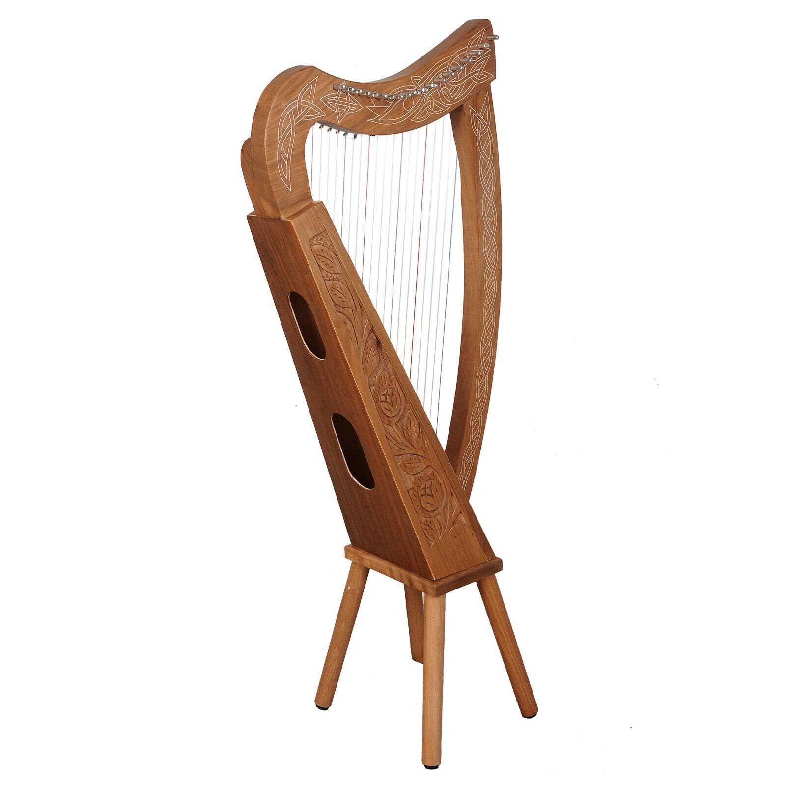 Featuring a treble and bass sound hole and a smooth solid wood soundboard,  this harp achieves a clear, well-rounded projection of sound.